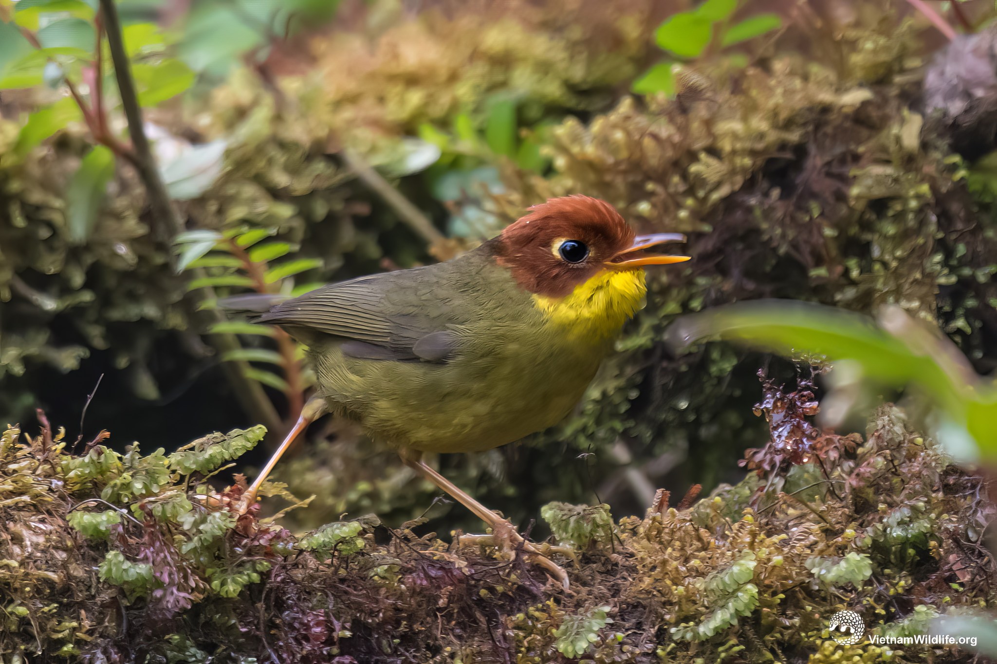Chestnut-headed tesia is very small species (about 9 cm). It has bright chestnut crown, contrasting bright yellow throat and upper breast, dark olive upperparts and very short tail. The juvenile miss chestnut crown and has more golden-buffish centre of throat and belly.