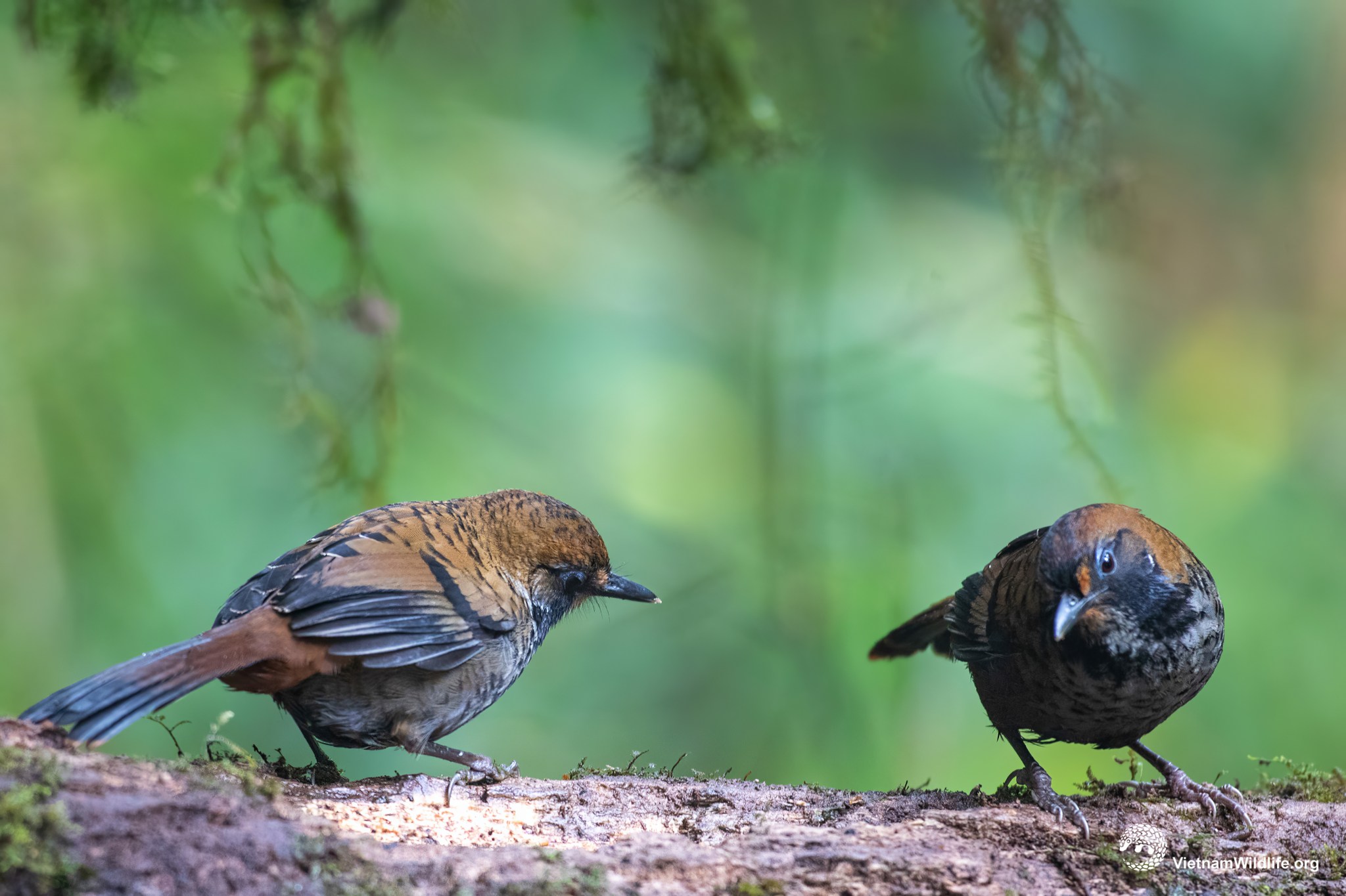 Rufous-chinned laughingthrush is a small sized species in the laughingthrush group (about 23 cm). It has very distinctive color with black cheeks and forehead, black-scaled white underparts and pale rufous-chestnut chin and vent.