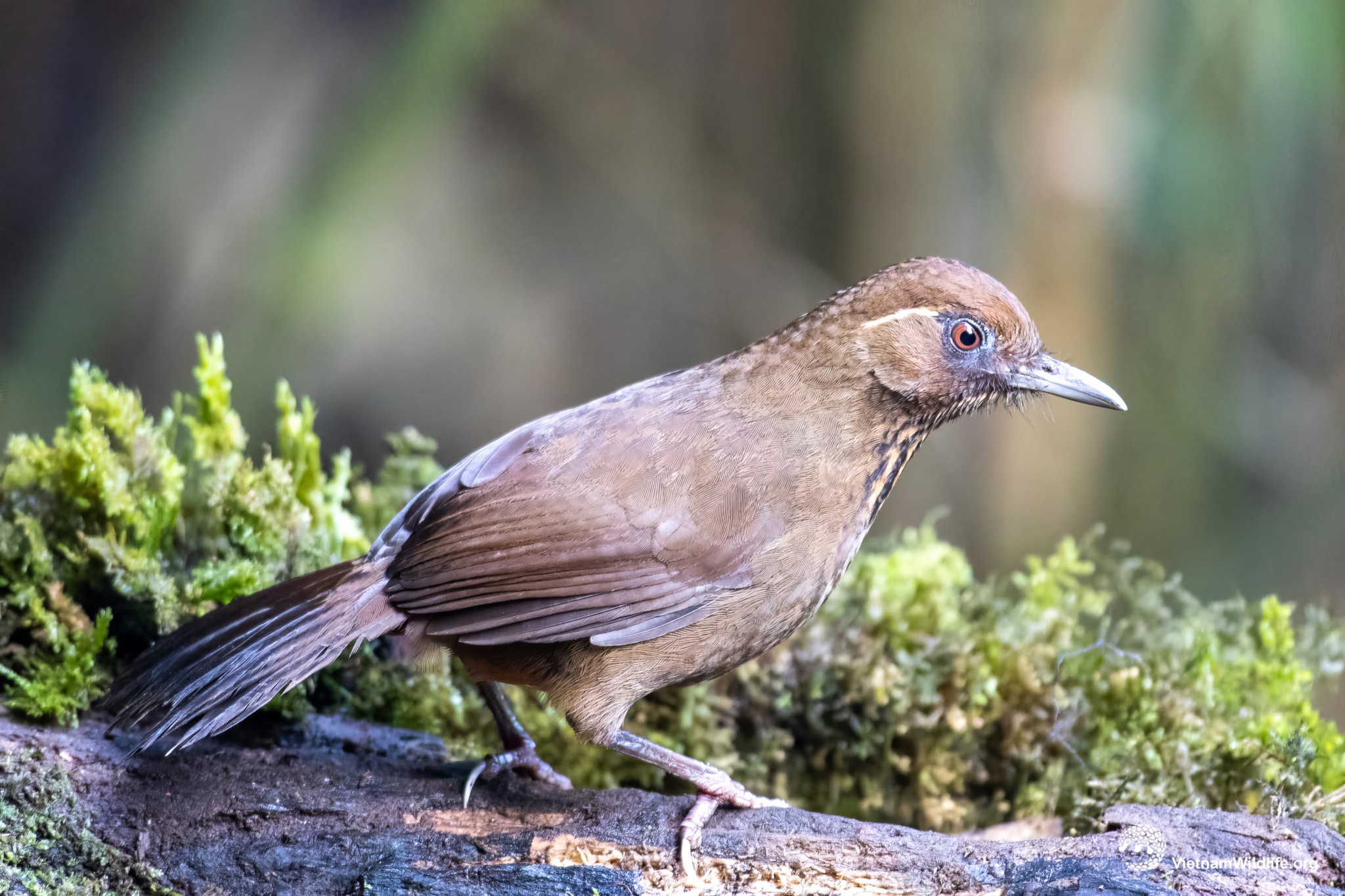 Spot-breasted laughingthrush is a medium sized species in the laughingthrush group (about 25 cm). It has narrow white supercilium behind eye, pronounced blackish and brown spots on throat and breast, and plain brown both underparts and upperparts. Male and female are similar.