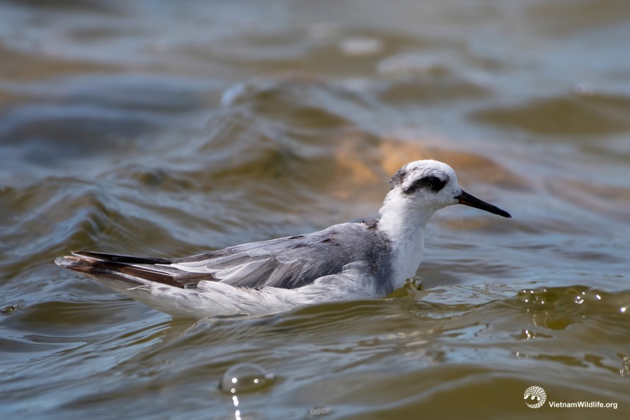 Red-necked phalarope is a small size species (about 18 cm). Outside of breeding season, its plumage is mainly black and white with distinctive needle-like black bill, black mask under white head and neck, mostly grey upperparts and white underparts. Male and female are similar in this time of the year.