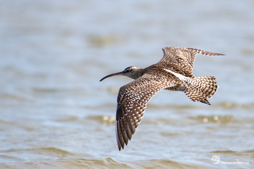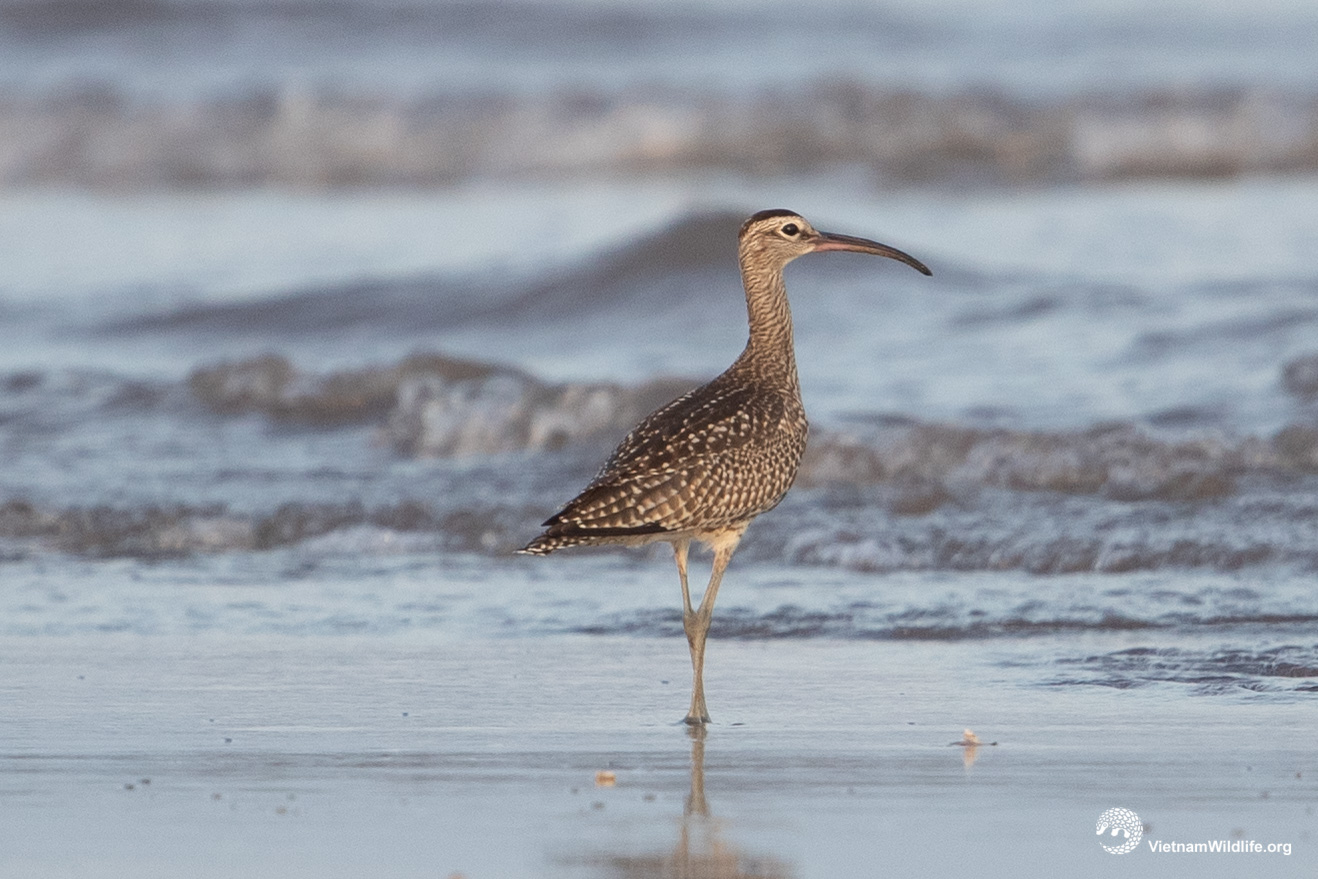 Whimbrel is a medium sized curlew (about 44 cm). It has a distinctively long curved bill, short blackish lateral eyestripe, broad whitish supercilium, mainly greyish brown plumage,buffish white neck and breast with heavy dark streaks. In flight, upperside appears all dark with contrasting clean white back and rump. Male and female are similar.