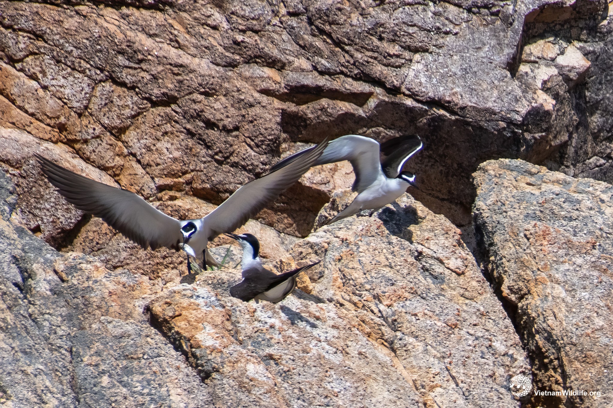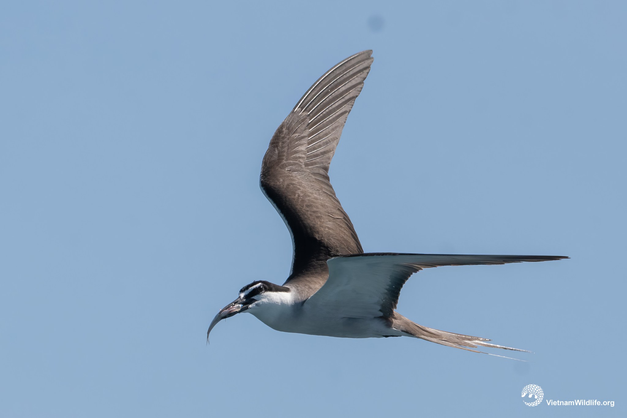 It is a large sized species in the tern group (about 40 cm). In breeding season, it has a clean white forehead contrast with black eyes-tripe, crown and nape, dark brownish-grey upperside, whitish neck. In non-breeding season, it is much duller and missing black eyes-tripe.