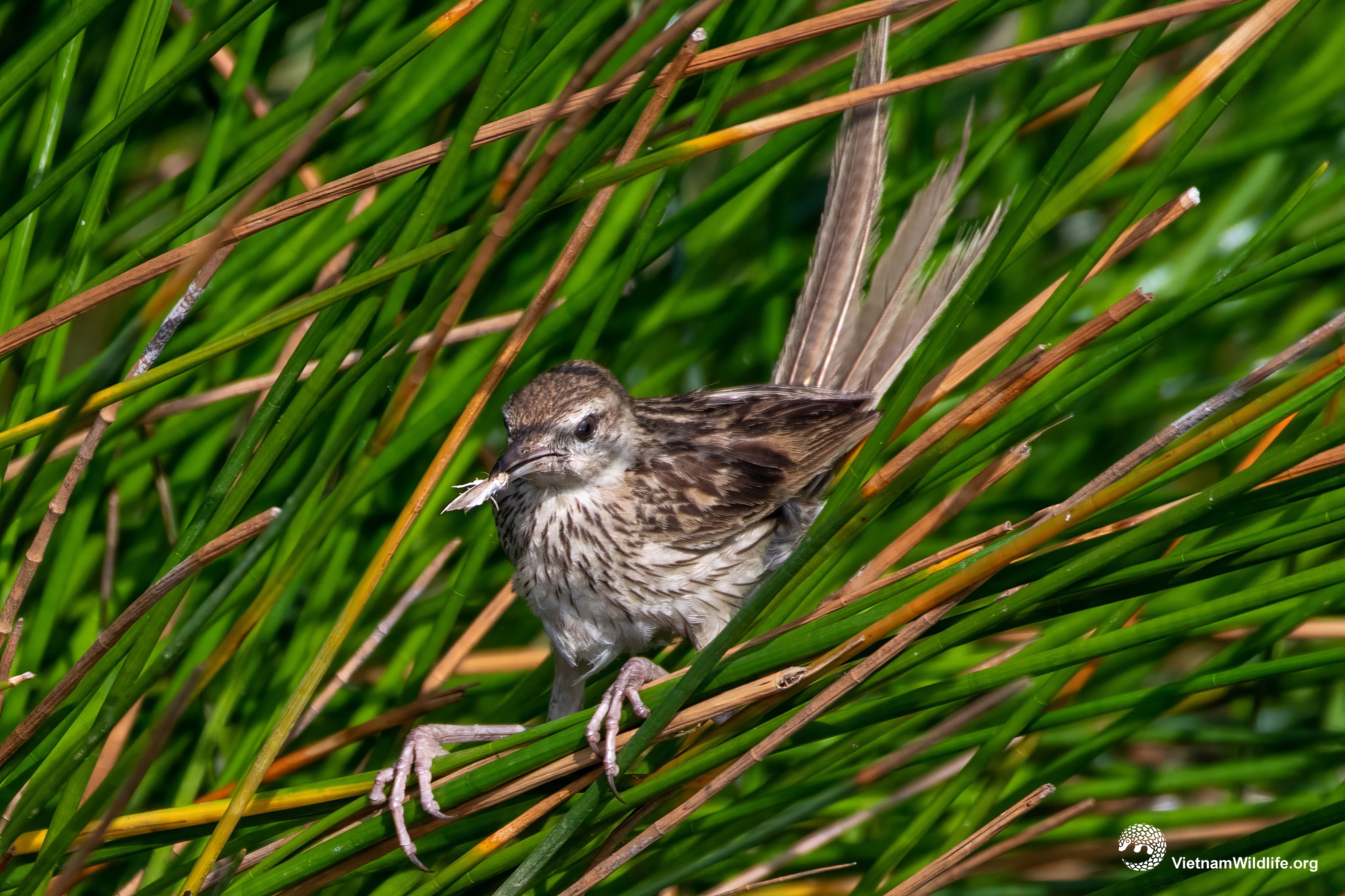 The striated grassbird is the largest species in the warbler group (about 24 cm). It has prominent white supercilium, largely whitish underparts with fine dark streaks on breast and flanks, buffish-brown upperparts with heavy dark streaking, and long graduated pointed tail. Male is bigger than female.
