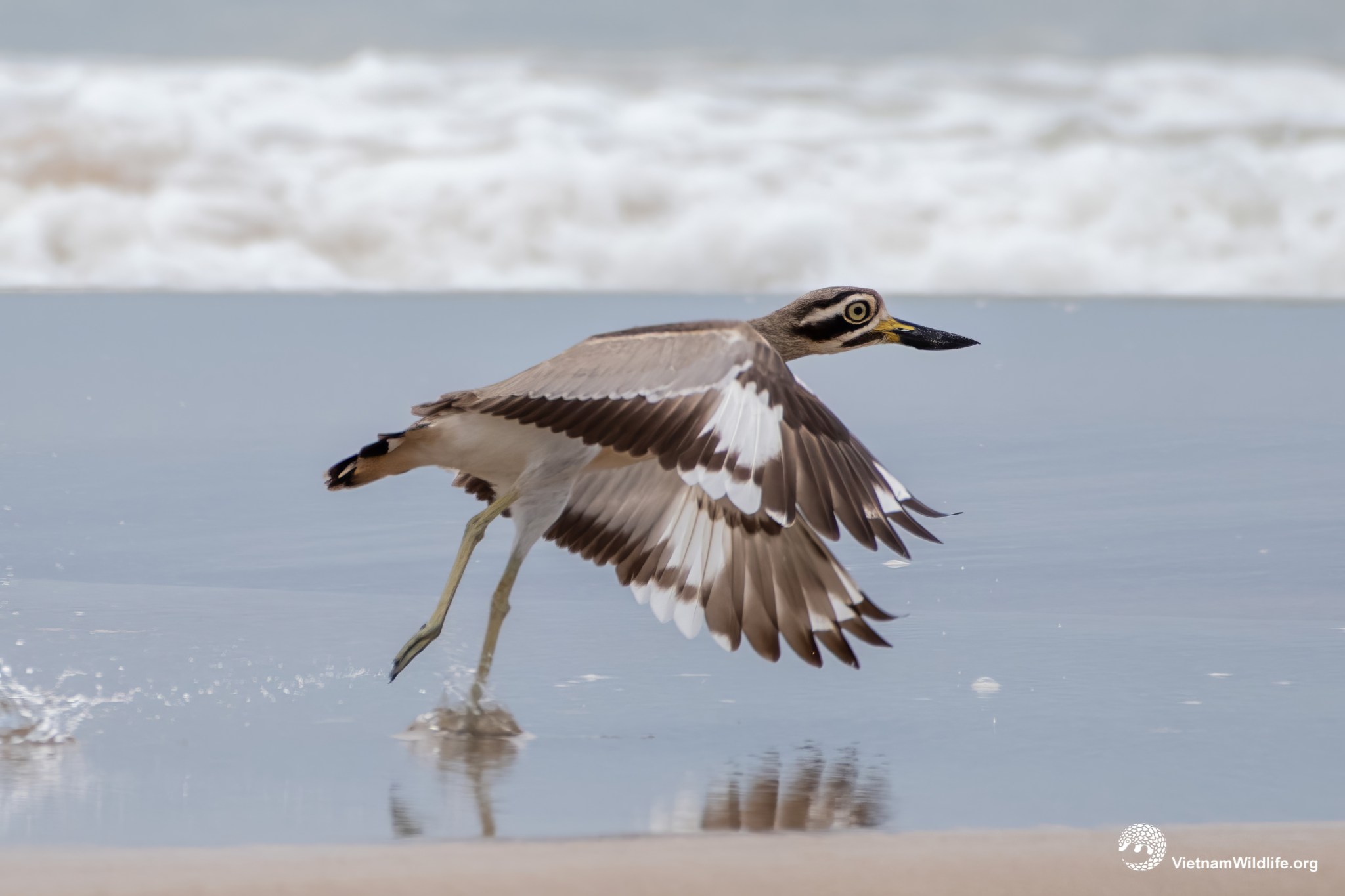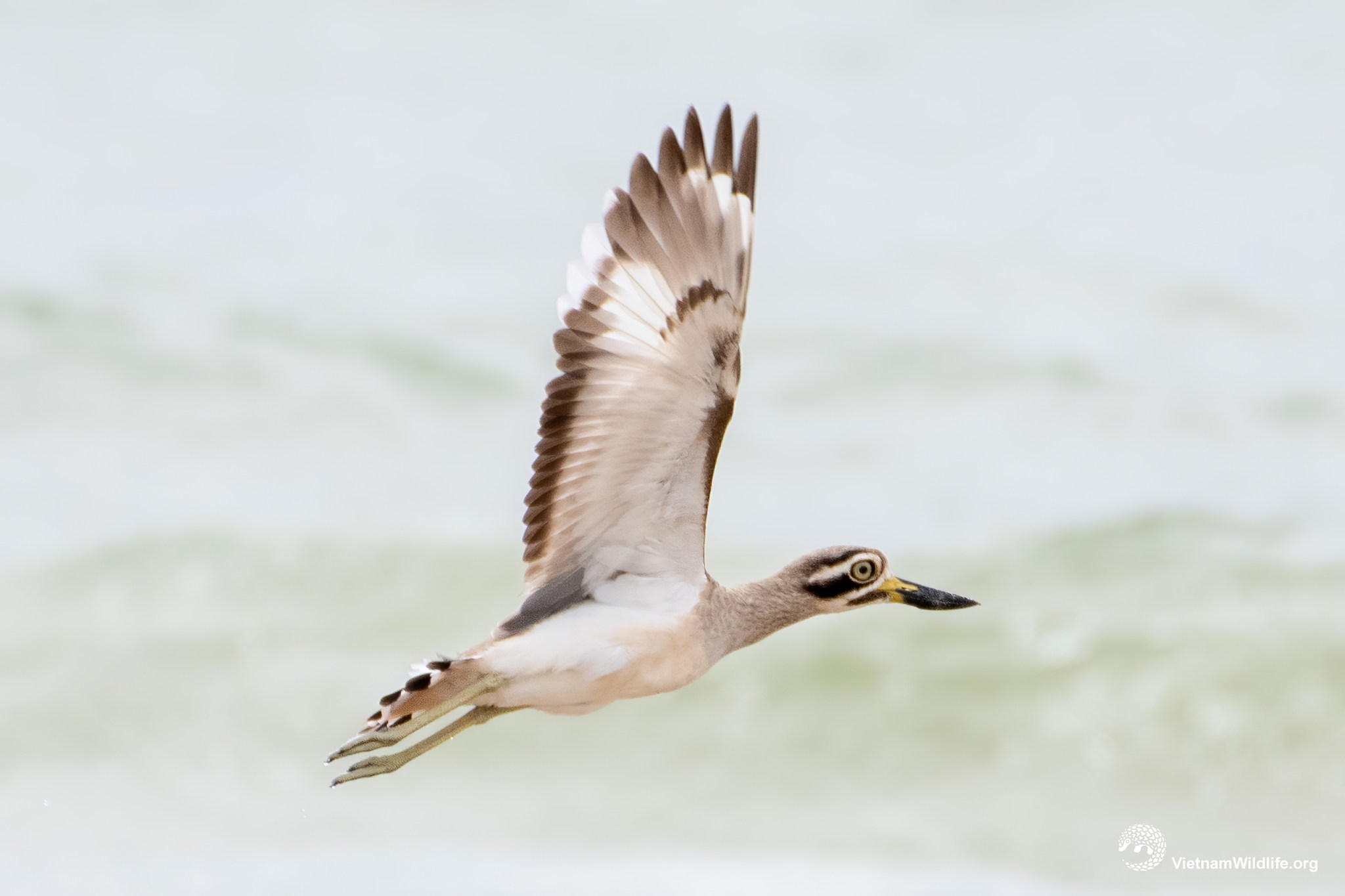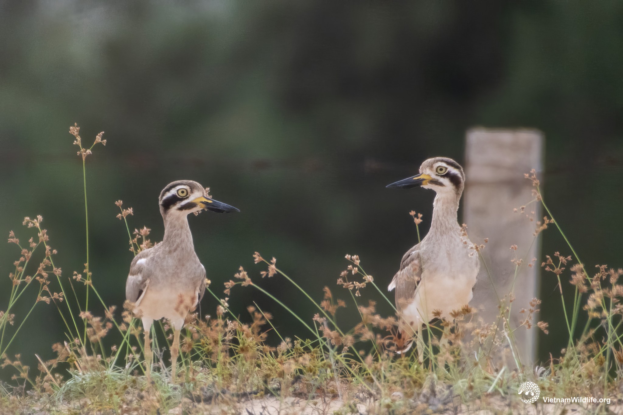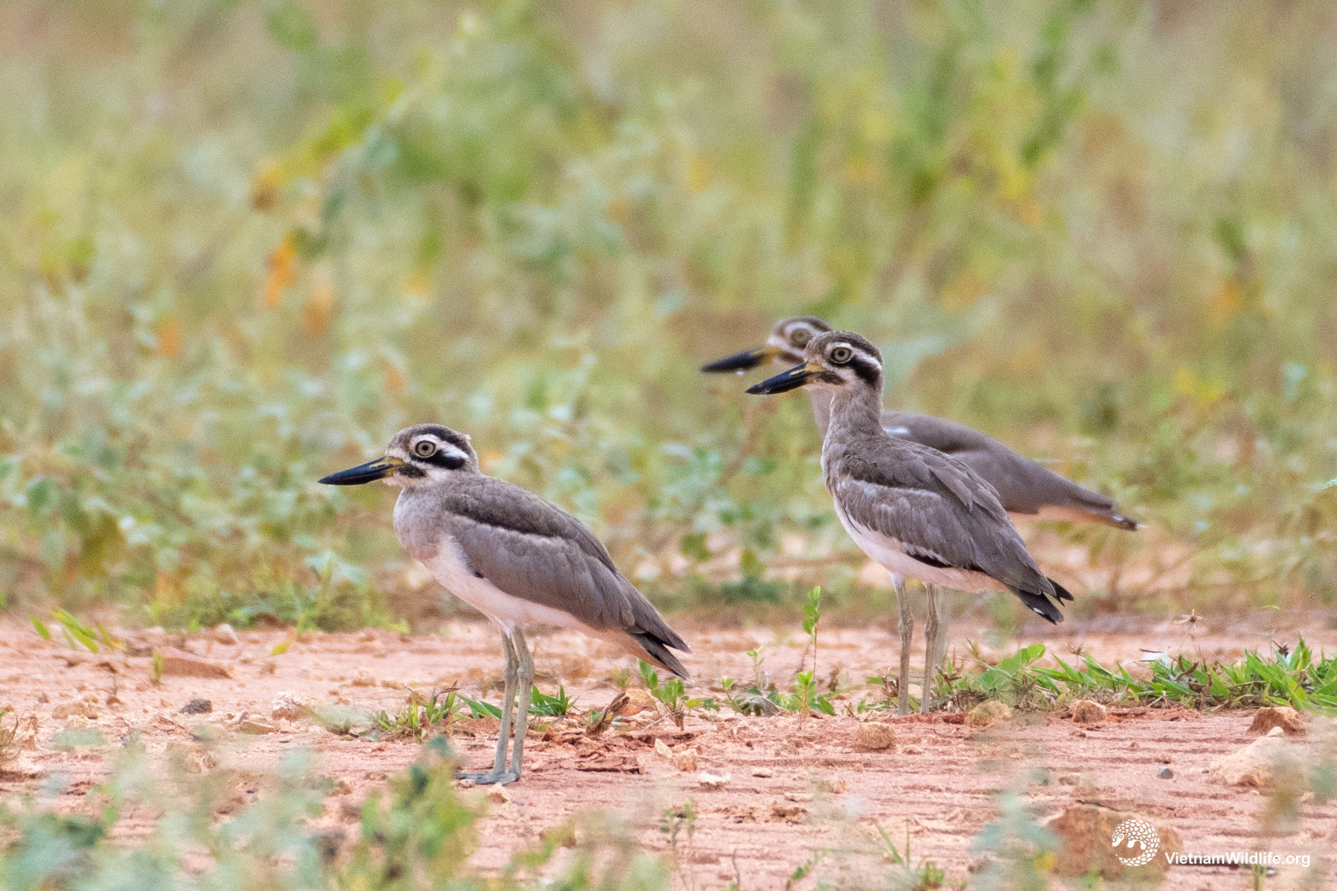 The Great Thick-knee is a fairly large species in the thick-knee group (about 50 cm). It has a very long and thick, slightly upturned black bill with a yellow base, a sandy-grey head, a whitish and thick supercilium, sandy-grey upperparts, and whitish underparts with a brownish wash on the foreneck and upper breast. Males and females are similar.