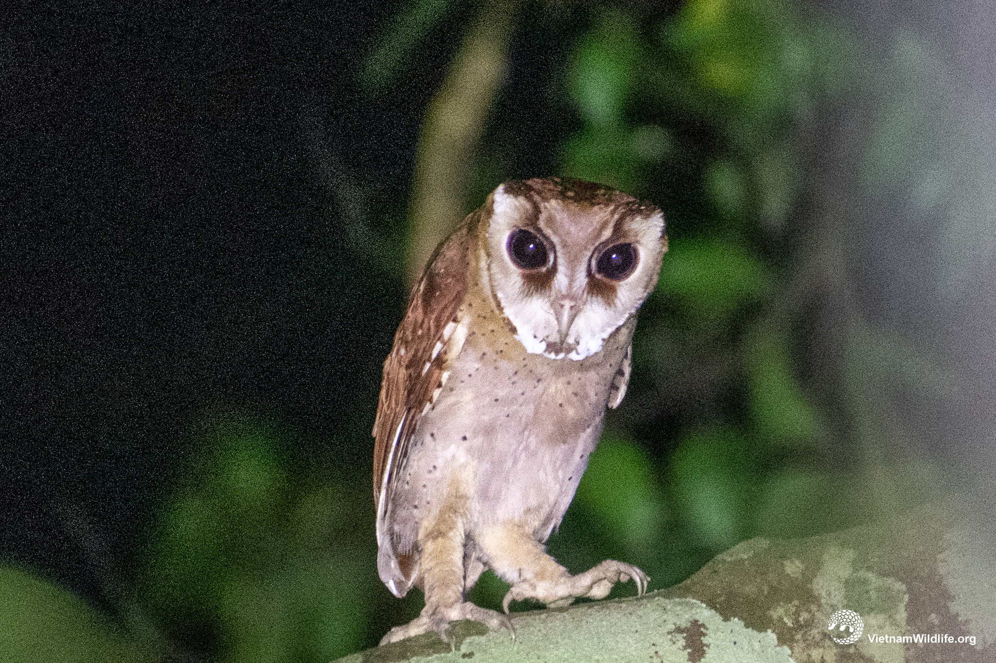 The Oriental Bay Owl is a small-sized species in the owl group (about 25 cm). It has a distinctive facial shape with dark-outlined buff facial discs, triangular rudimentary ear tufts, large dark eyes, pale buff-grey upperparts with golden markings, and buff-white underparts with blackish speckles. Males and females are similar.