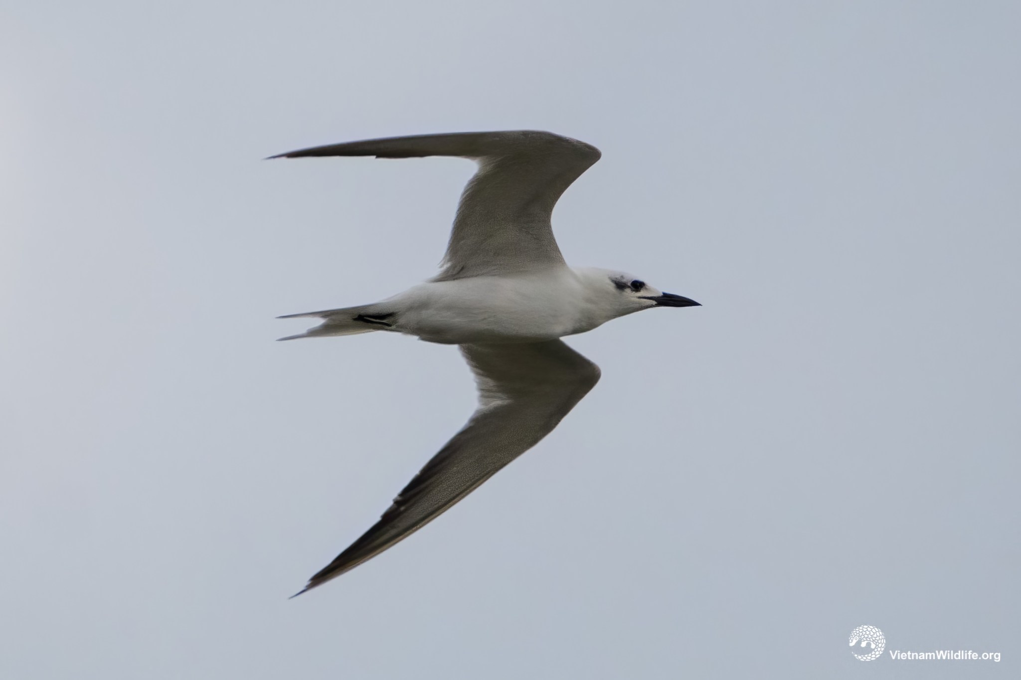 The gull-billed tern is a large-sized species in the tern group (about 35 cm). In the non-breeding season, it has a thick black bill, black ear-coverts, a white head, a pale silvery-grey rump with a shallowly forked tail, and white underparts.