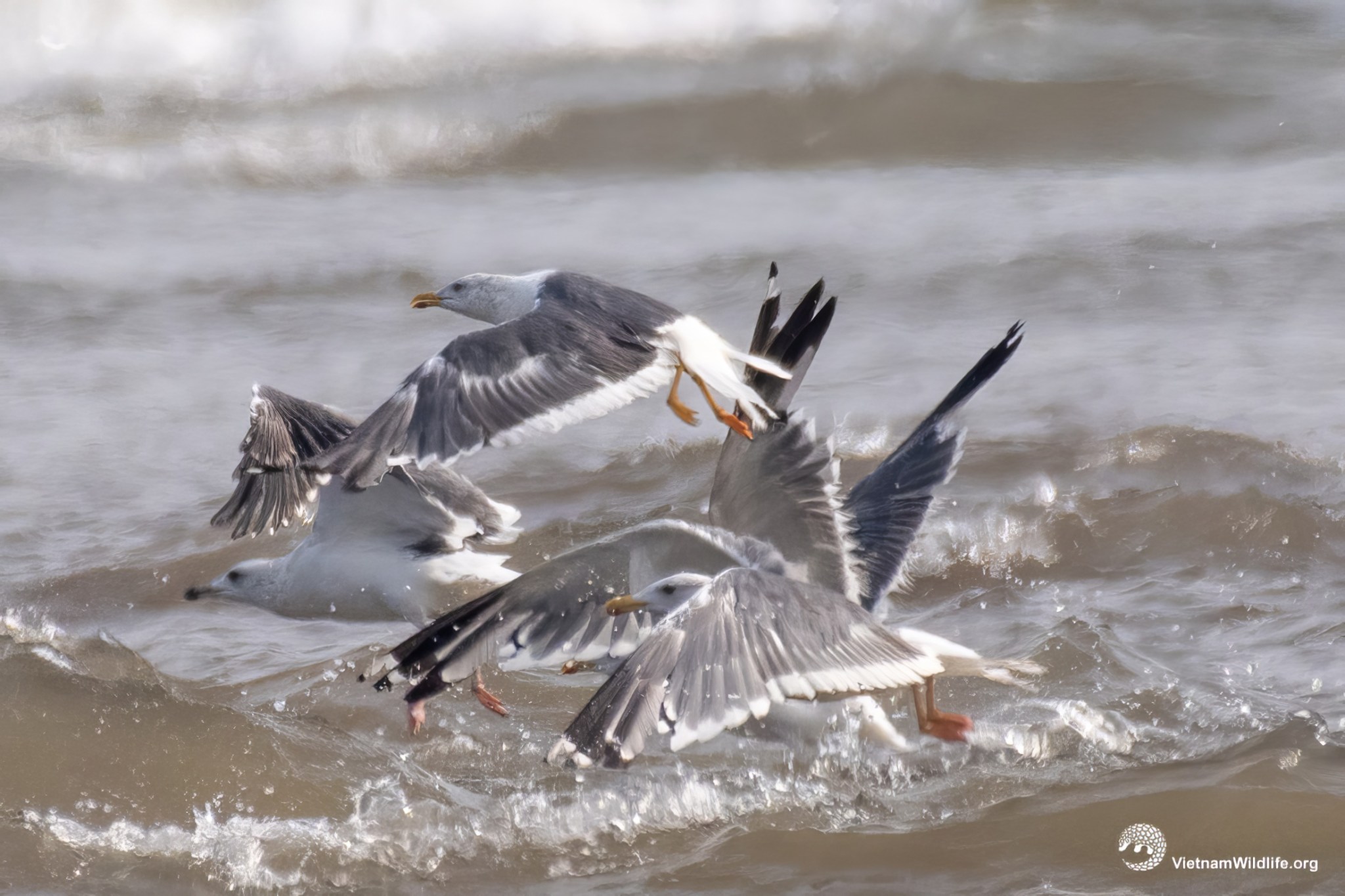 Mongolian gull is a large sized species in the gull group (about 65 cm). In non-breeding season, it has a typically white head with very little and thin streaks, distinctly yellowish bill, pale grey upperparts, white underparts and pink legs (rarely yellow). The first winter, it has distinctly ‘frosty’ upperparts with black bill,