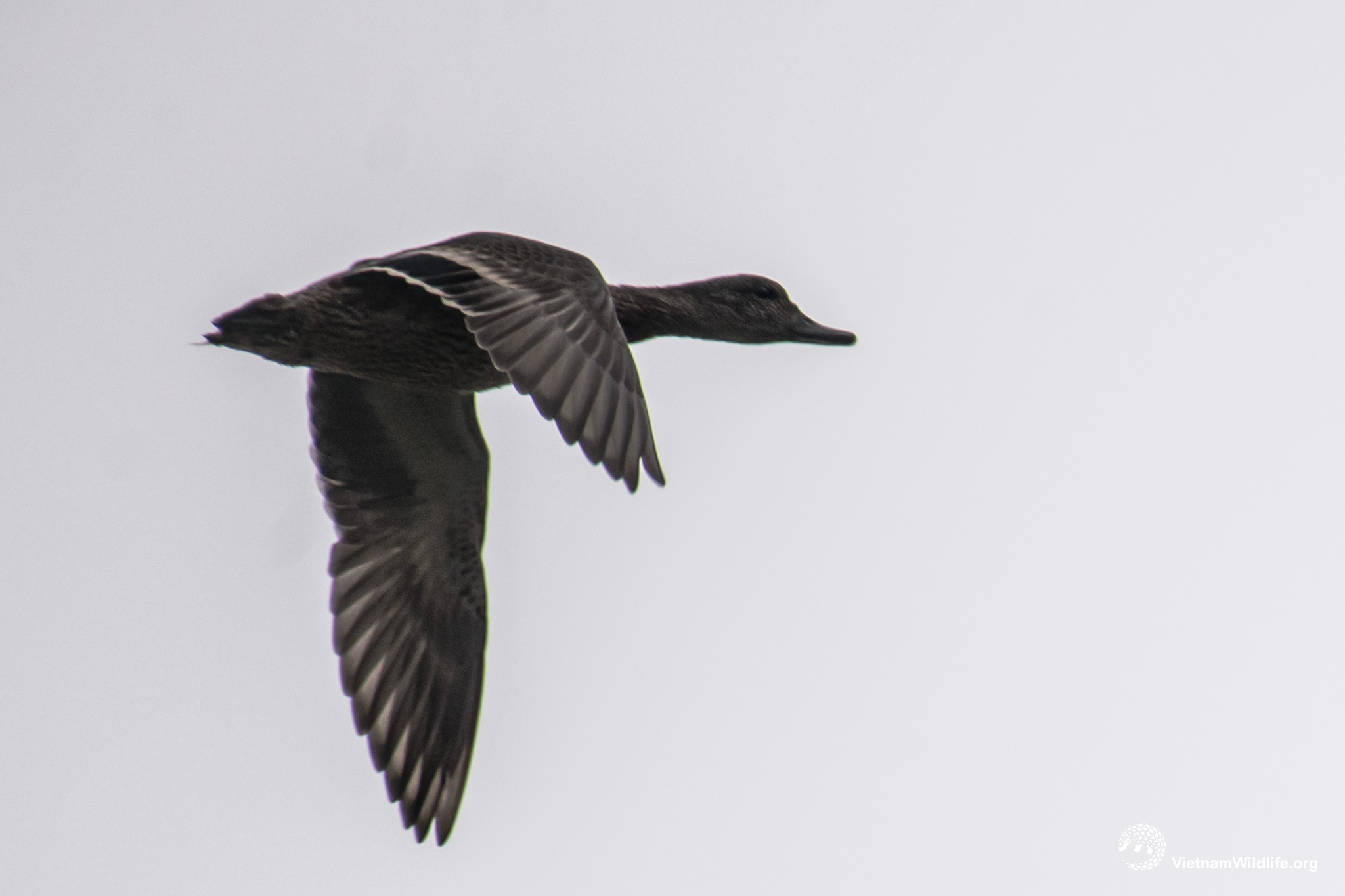 Falcated duck is a medium sized species in the duck group (about 50 cm). The male has distinctive dark glossy green head, white throat and upper foreneck separated by black thin band, and mostly greyish remainders. The female is different from the male with plain greyish-brown head.