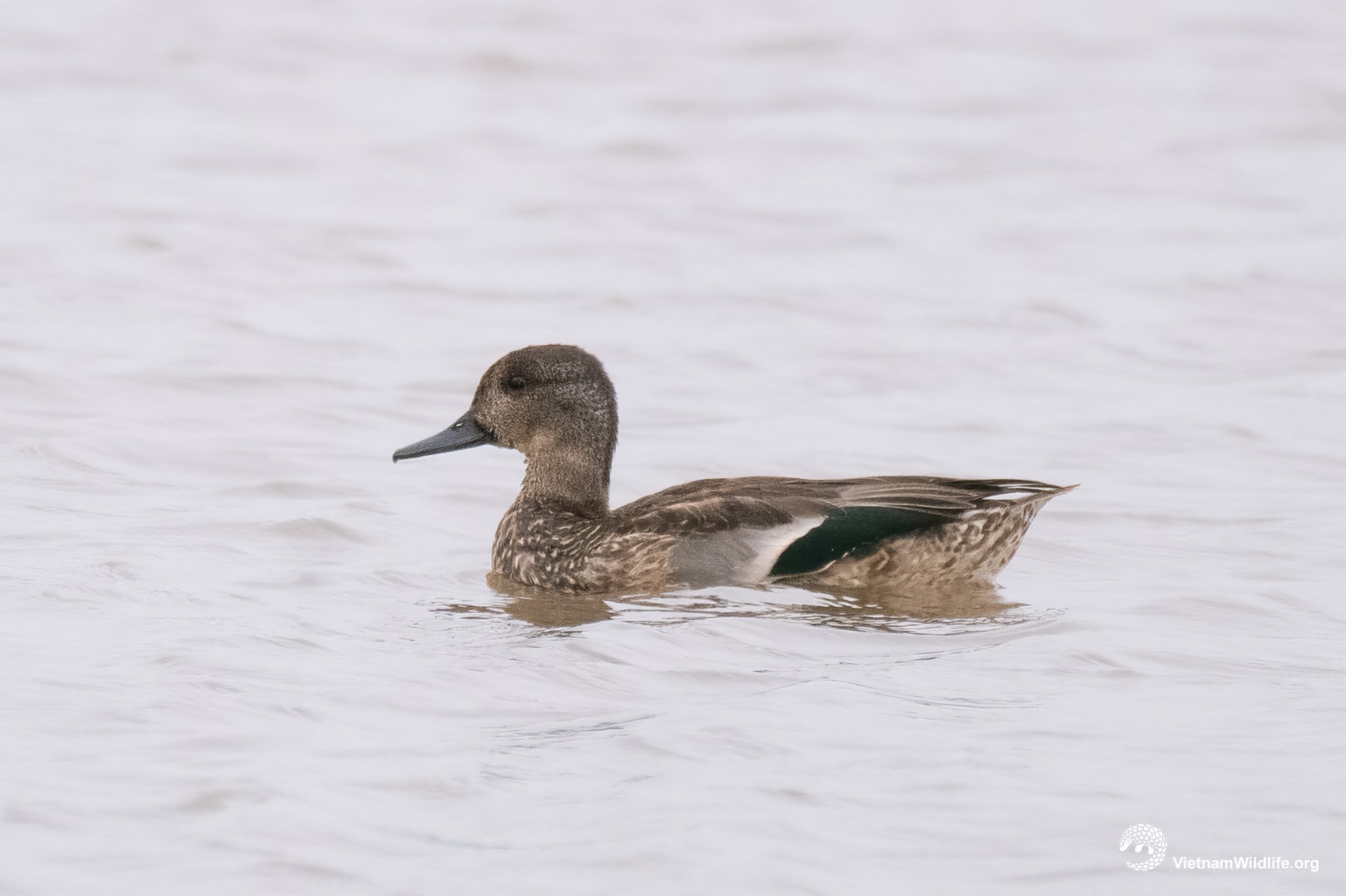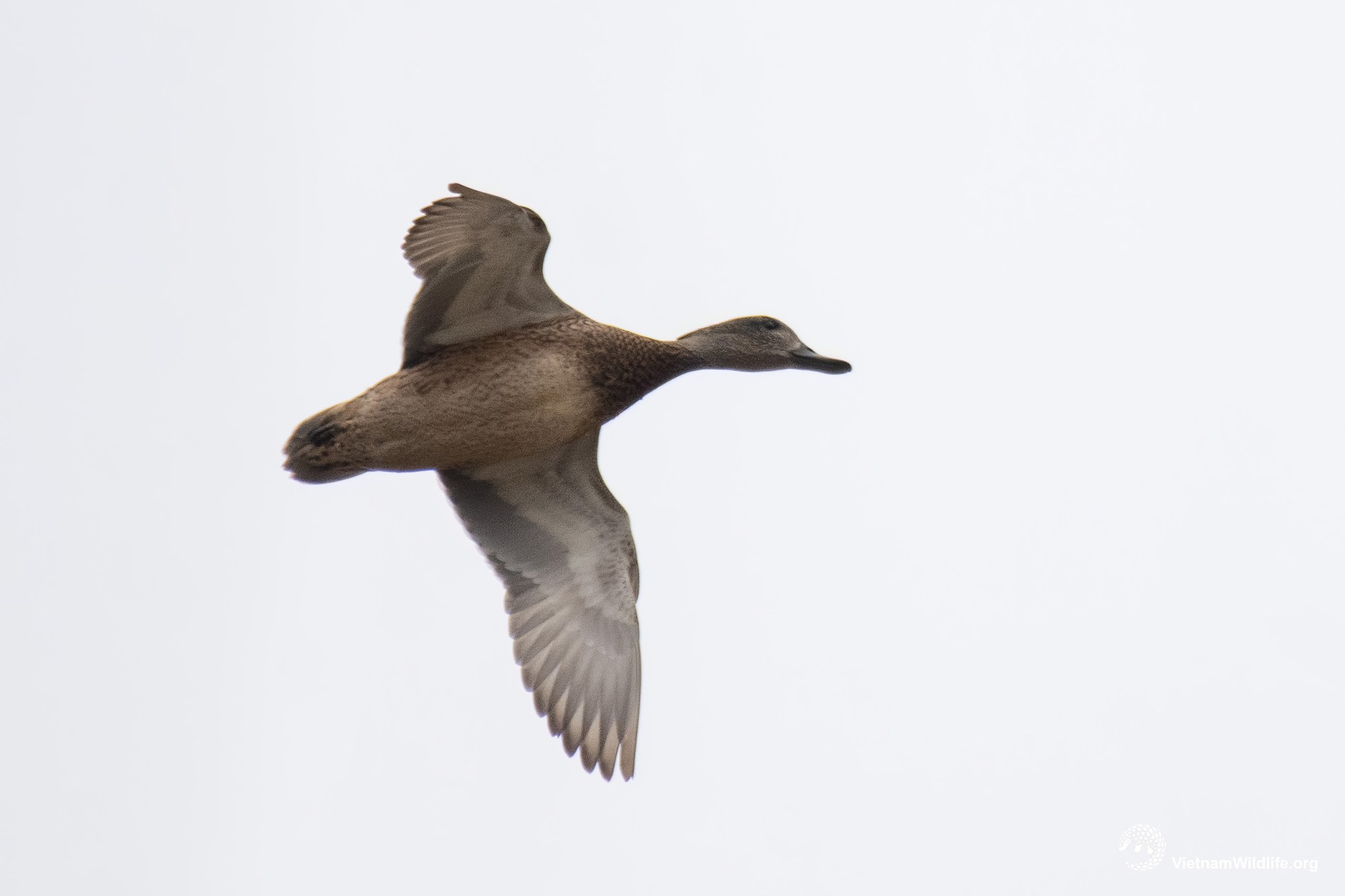 Gadwall is a medium sized species in the duck group (about 50 cm). Male has overall greyish plumage with black bill, small blackish eye-stripe and small white stripe in wing. In fight, it has obvious square white patch on inner secondaries. Female is similar to male but has an orange bill.