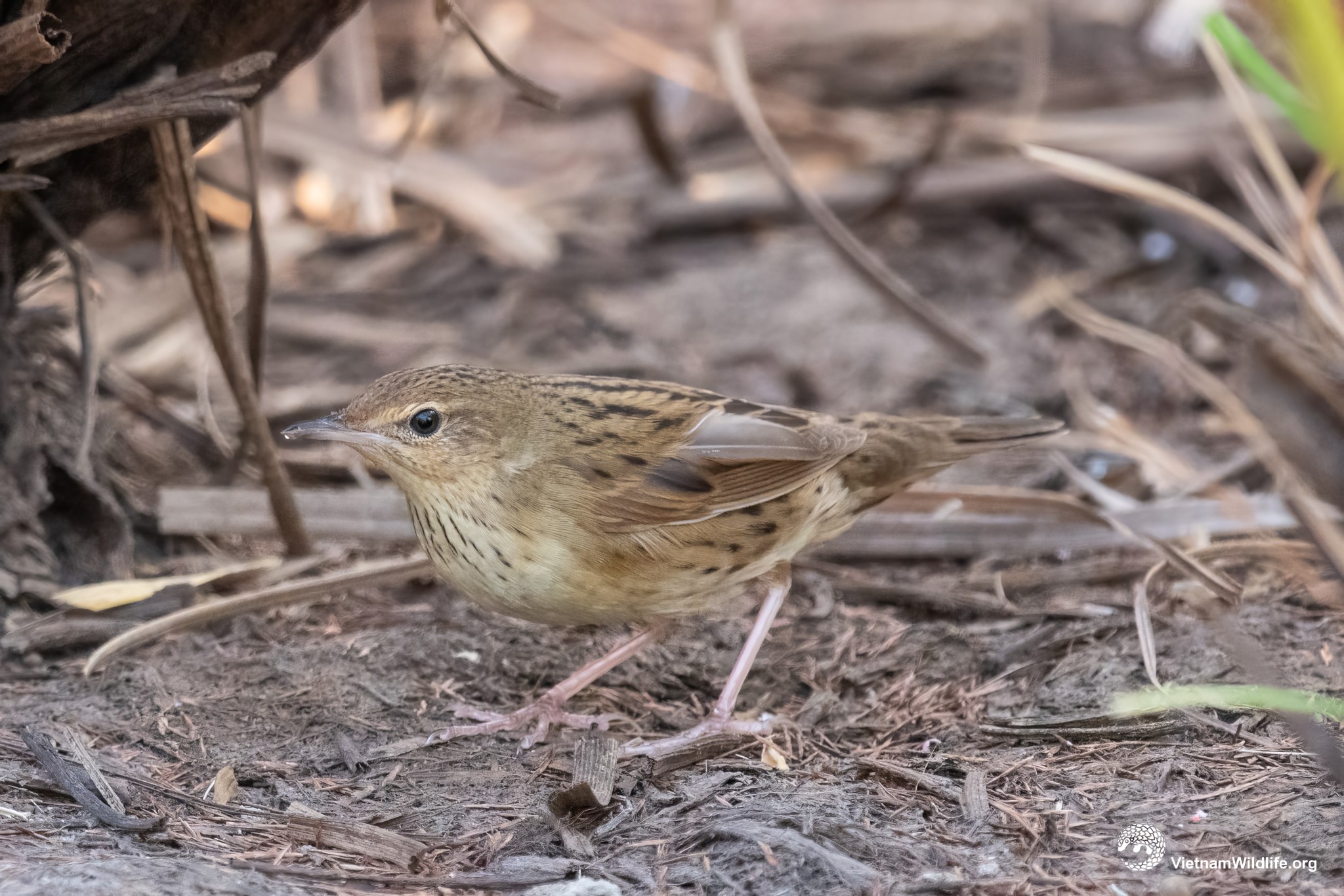 The Lanceolated Warbler is a small species in the warbler group (about 12 cm). It has whitish supercilium and prominent rufous plumage with a heavily streaked appearance, including distinct streaking on the rump, lower throat, breast, flanks, and undertail-coverts. The male and female are similar.