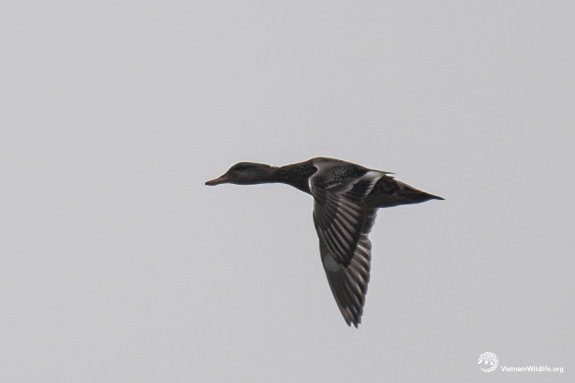 Gadwall is a medium sized species in the duck group (about 50 cm). Male has overall greyish plumage with black bill, small blackish eye-stripe and small white stripe in wing. In fight, it has obvious square white patch on inner secondaries. Female is similar to male but has an orange bill.