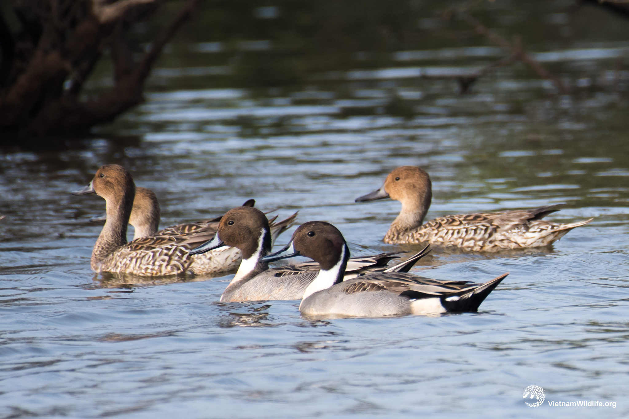 Northern pintail is a medium sized species in the duck group (about 55 cm). The male has unmistakable long tail (up to 10 cm), dark chocolate-brown head and upper-neck, white upper-breast, greyish upperparts. The female has a plain brown head, brown spotted-underparts and distinctive greyish underwing (in flight).