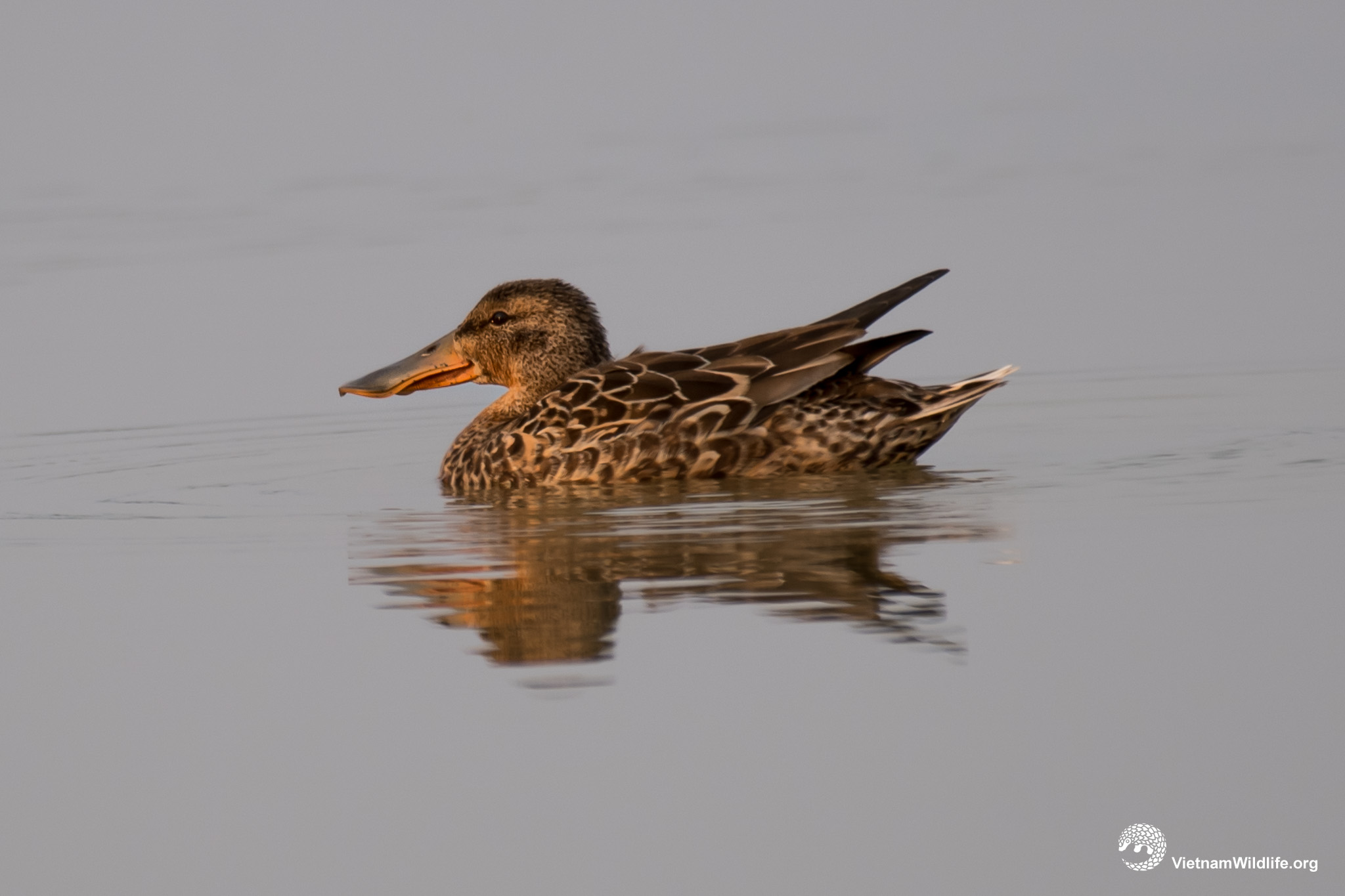 Northern shoveler is large sized species in duck group (about 50 cm). In non-breeding season, male has dark and spatula-shaped bill, dark grey head and upper neck, white breast and white patch on sides of vent, and mostly chestnut sides diagnostic. Female has similar bill shaped but duller, scaly brownish plumage with heavily spotted.