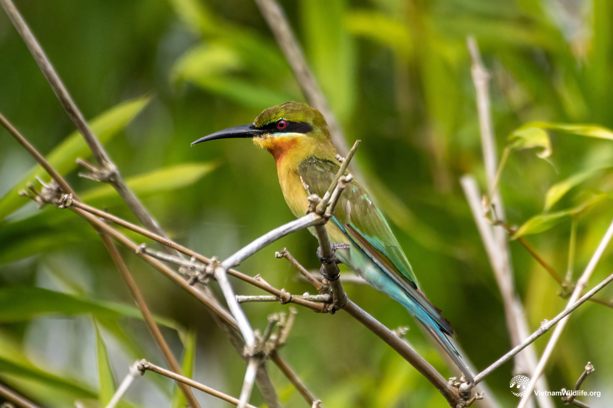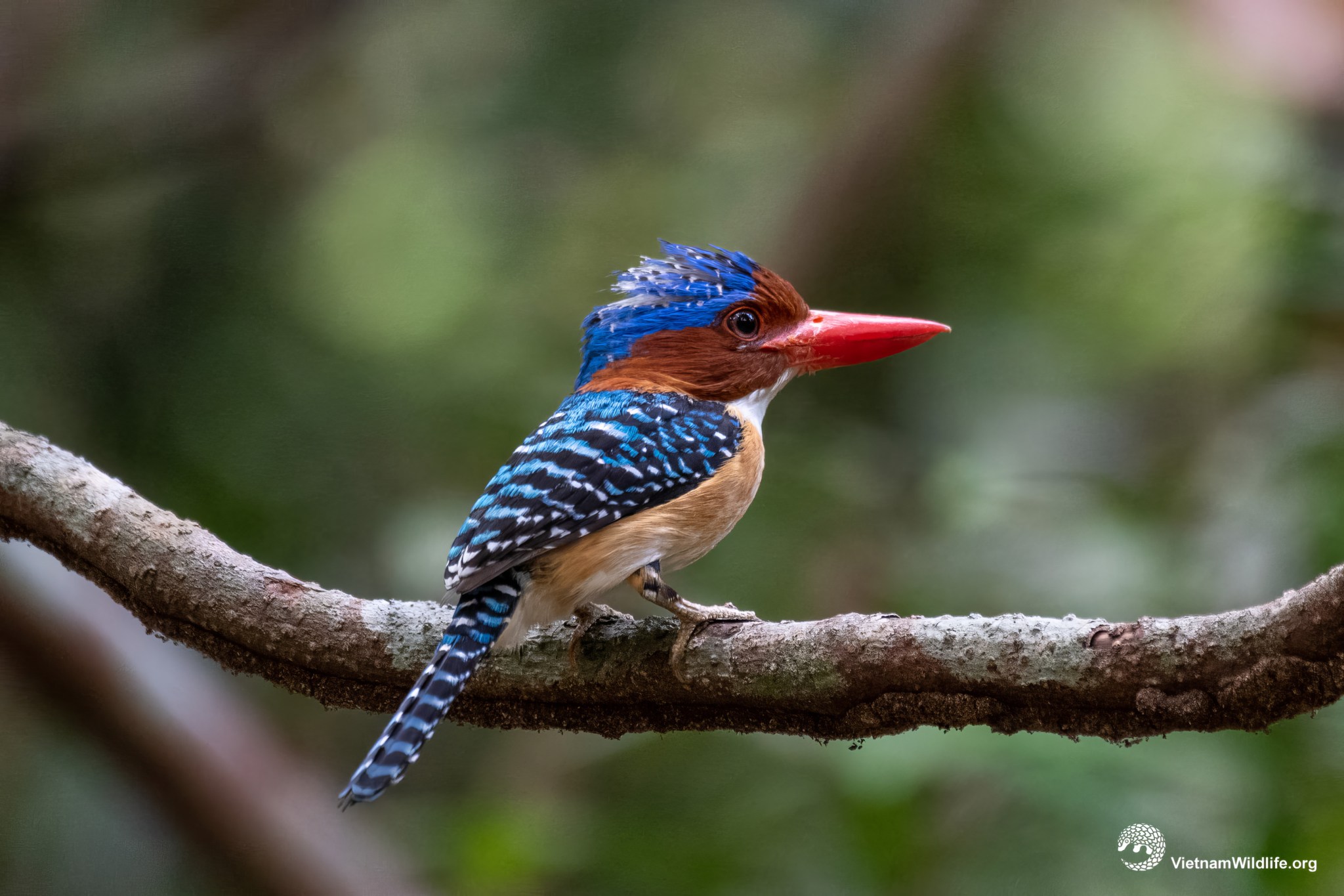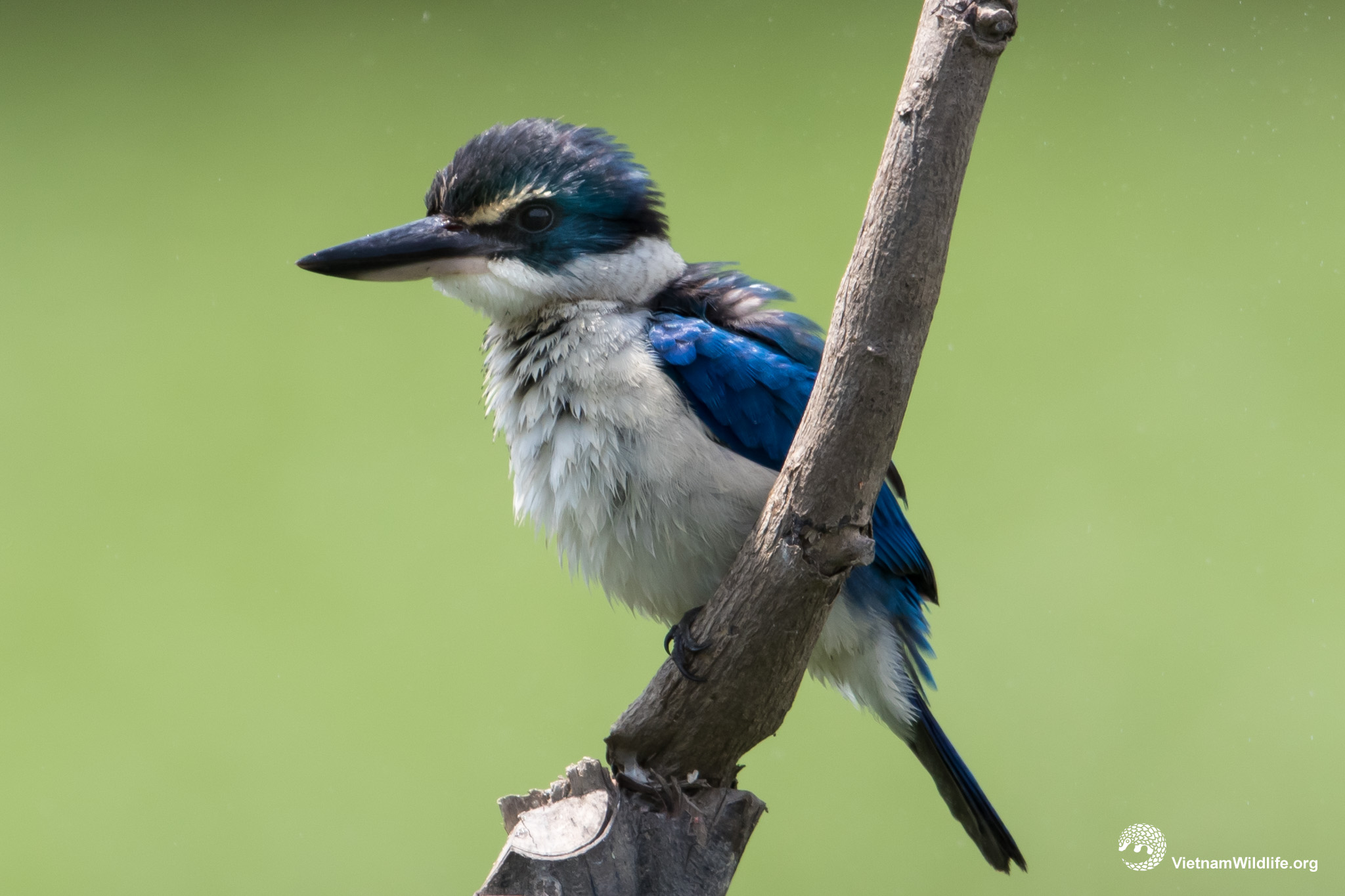 Black capped kingfisher is big sized kingfisher (about 30 cm) with black head and white neck collar. It has blue upper-parts with a black patch in their wings, white throat, and rufous underparts. It has red large bill and legs. Both sexes are similar.
