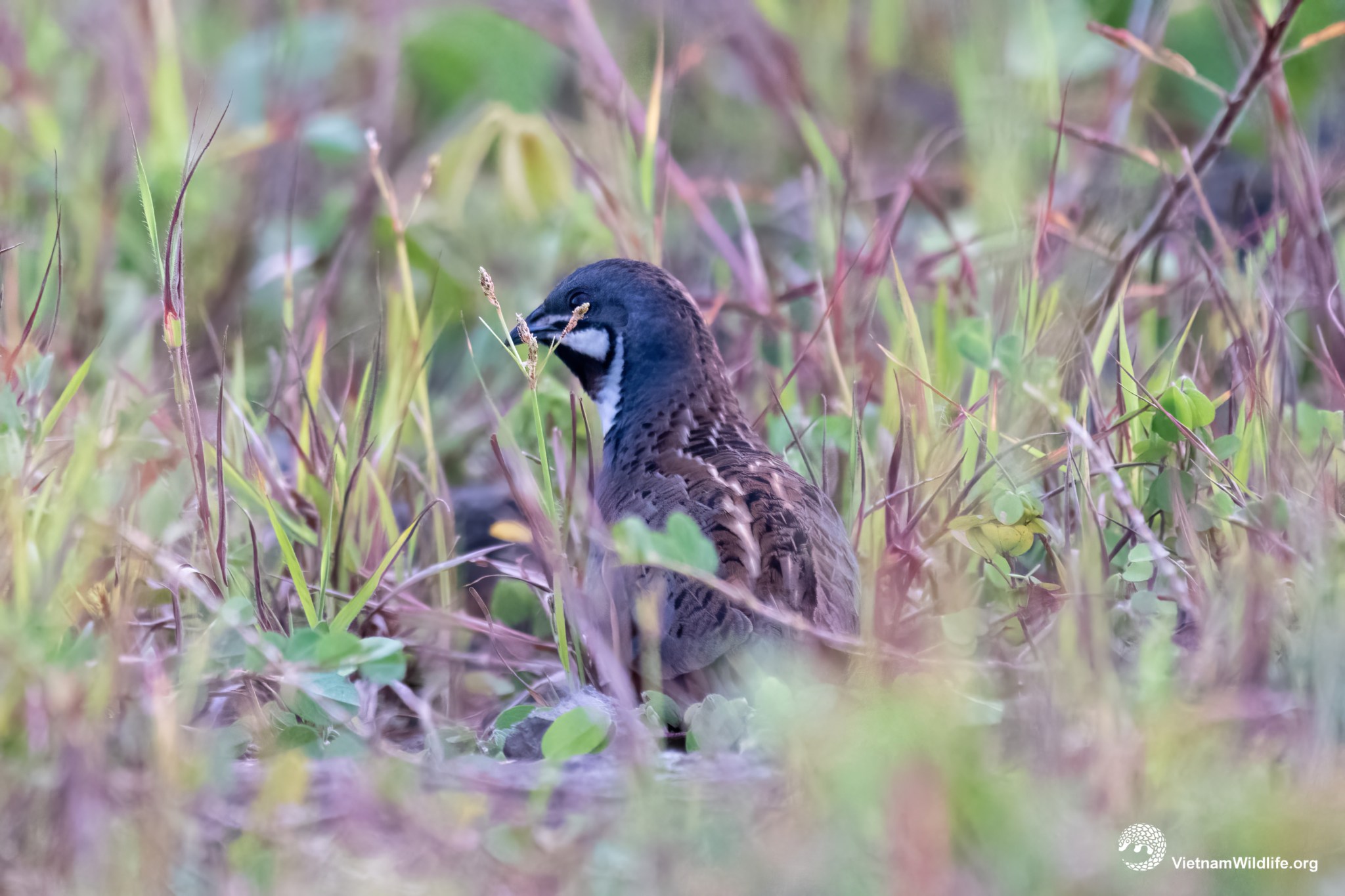 It is a very small sized species in the quail group (about 14 cm). Male and female are very distinguished. Male has a slaty-blue forehead, upper sides of head, breast, a distinctive black throat with enclosed white malar and broad white crescent on upper breast, and chestnut lower breast to vent diagnostic. Female has a buff supercilium and foreneck, more uniform upperparts with much less distinct buff to whitish streaks, distinct small blackish bars on breast and flanks.