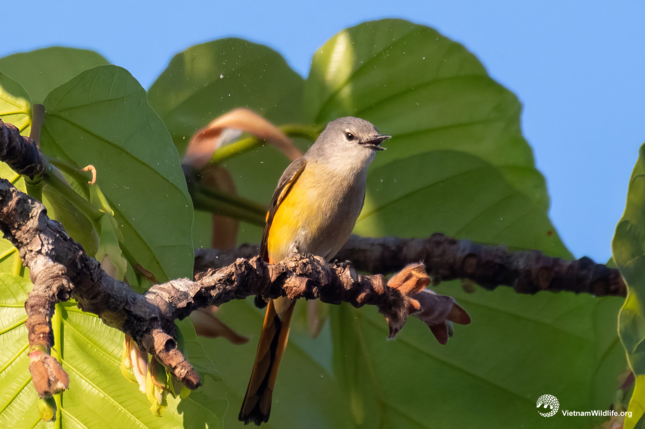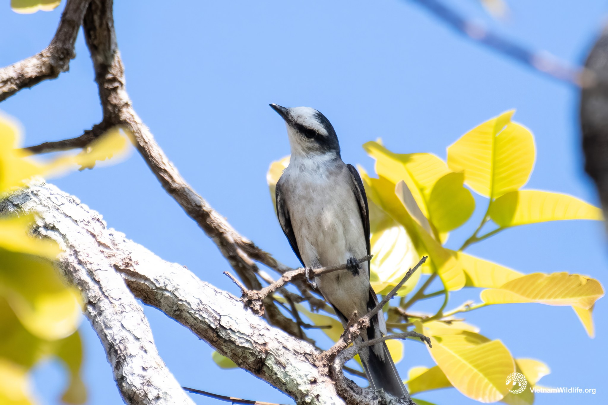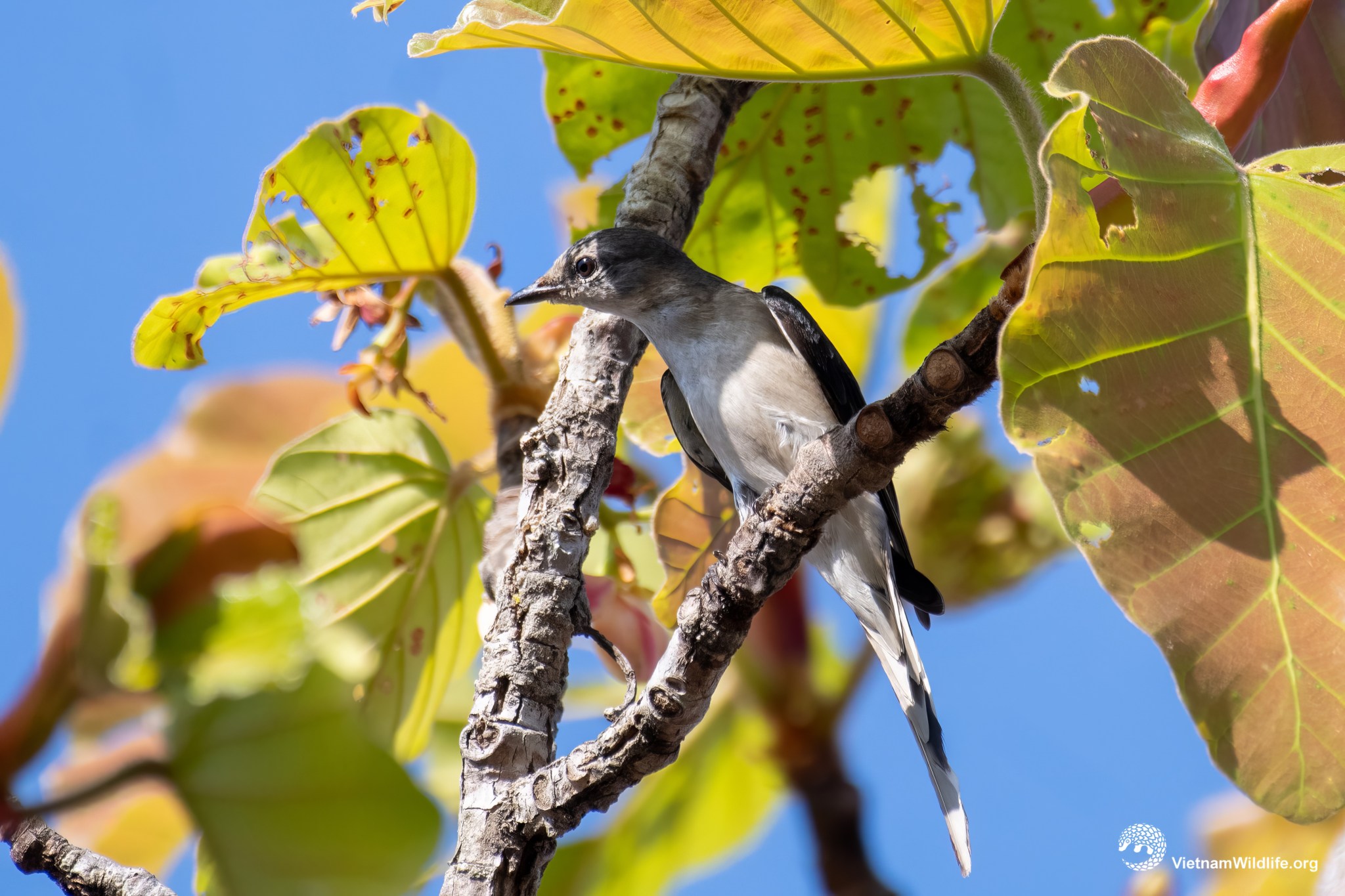 Ashy minivet is a large sized species in the minivet group (about 20 cm). The male has a a black eye-strips contracting to white forecrown and underparts diagnostic, black crown to nape and greyish upperparts. Female has pale grey crown and upperparts, a little whitish band across forehead to eye, and grey-whitish underparts.