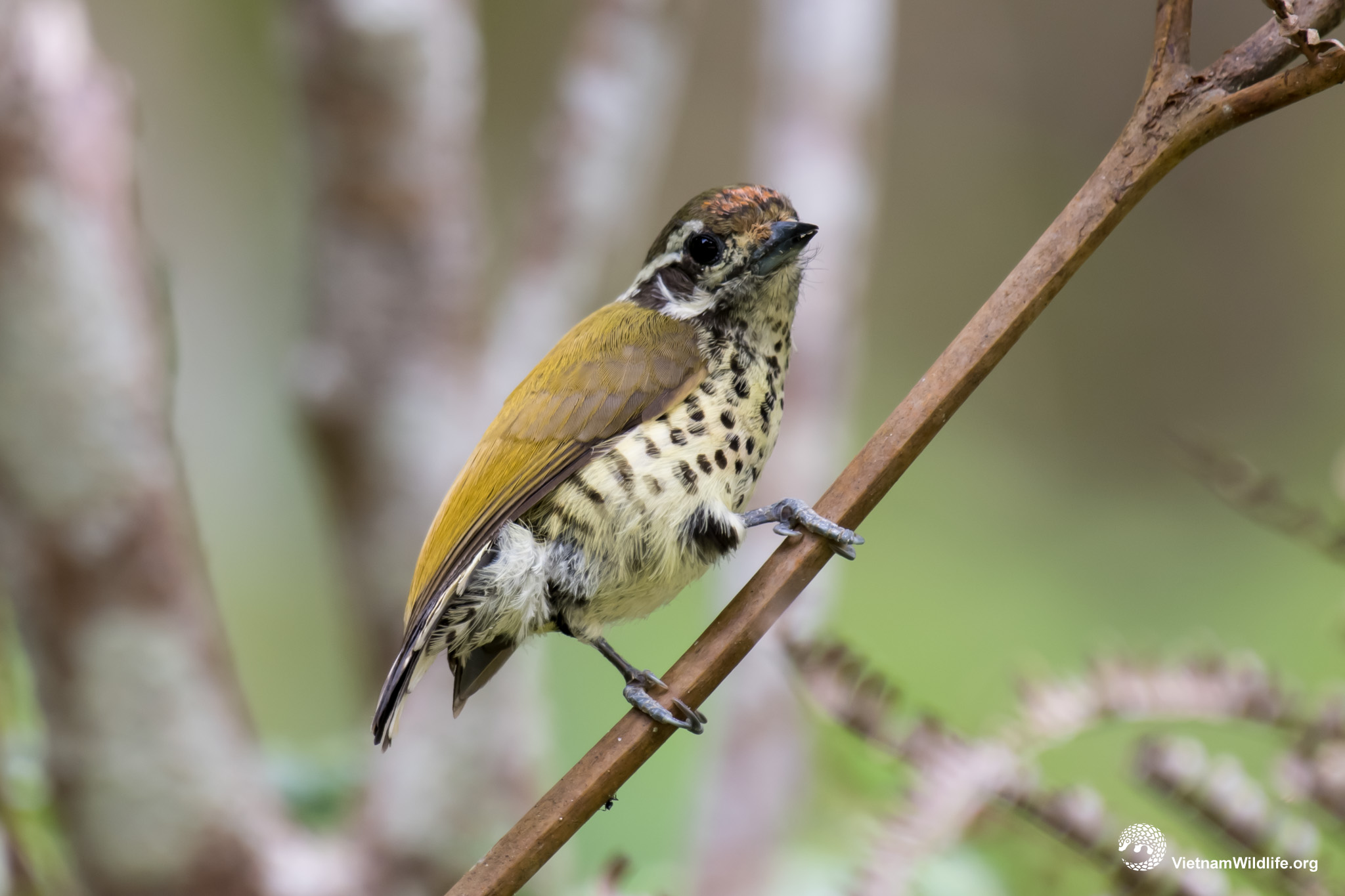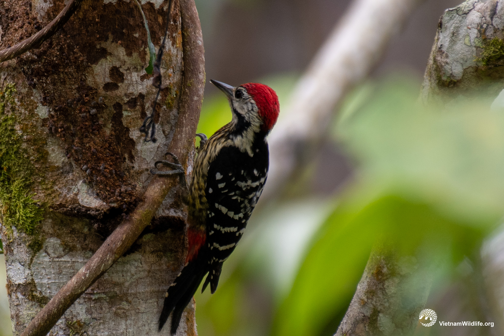 Greater flameback is large sized species in woodpecker group (about 32 cm). It has golden-back, long and broad black eye-stripe to neck-side, white underparts with small black scales and black tail. Male has red, female black crown.