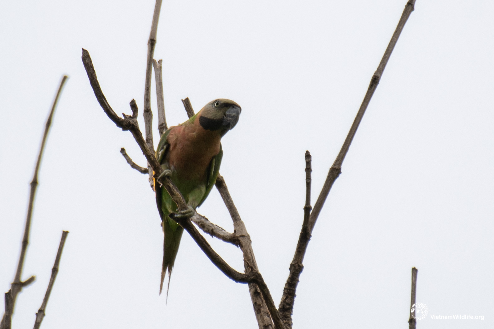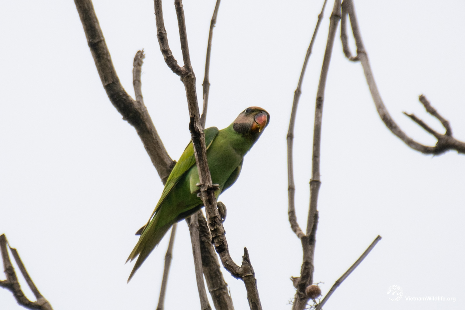Red-breasted parakeet is medium sized species in the parrot group (about 35 cm). Male has a thick and red bill with yellow tip, black line crossing forehead, very broad black band crossing throat and violet-tinged deep pink breast and mostly green upperparts. Female has a black bill.