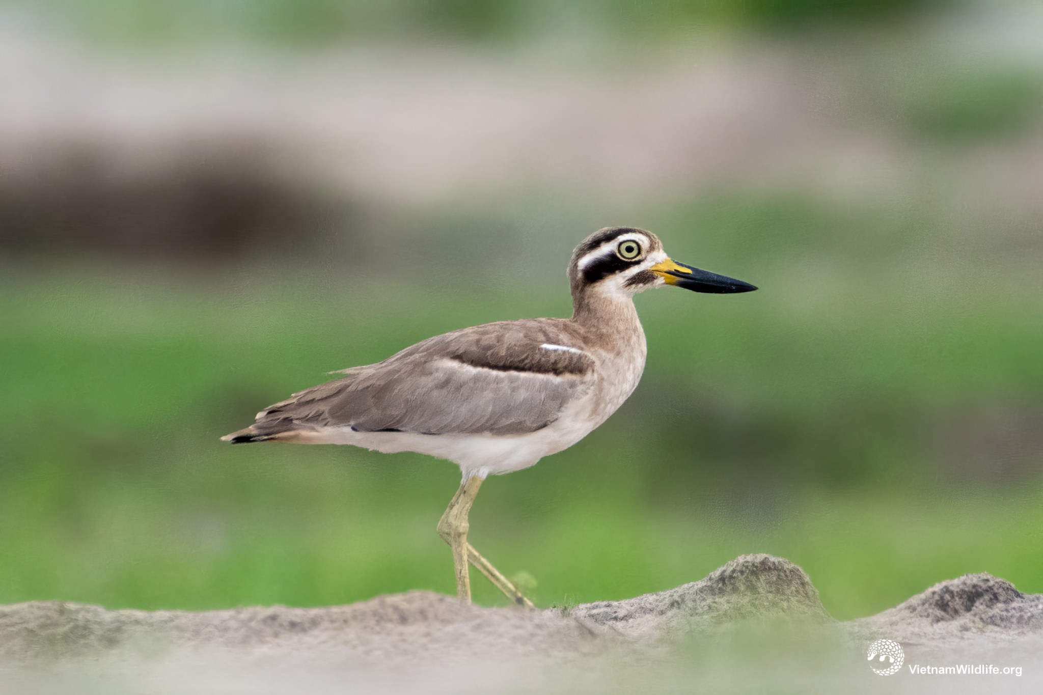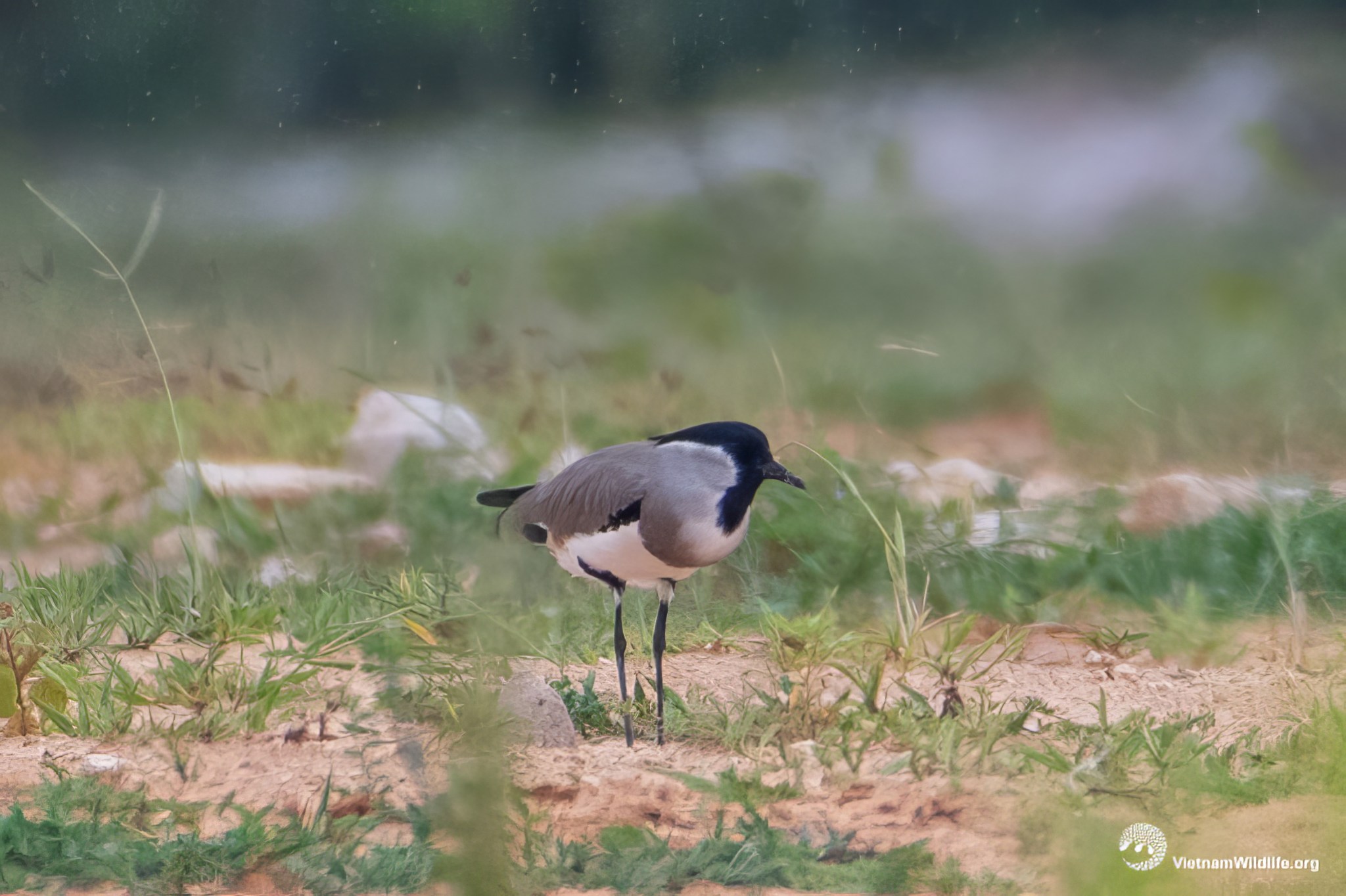 The black-collared starling is a large-sized species in the starling group (about 29 cm). It has prominent yellow facial skin, a whitish head, blackish-brown upperparts with a white band across the rump, whitish underparts with a broad blackish diagnostic collar, and a black bill, legs, and feet